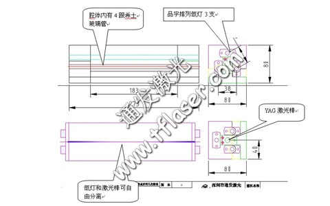 1本激光器采用全铜度纯金反光瓦,三支灯管承品字排列,激光棒中间。