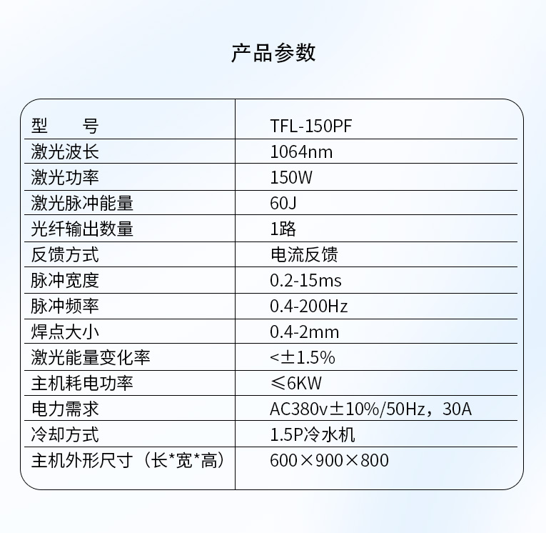 半岛(中国)激光TFL-150PF光纤激光焊接机,采用能量反馈控制模式,能量较稳定,光纤传输光束质量好,适合0.5mm以下金属不锈钢板材的精密激光焊接,是批量五金半岛官网登陆入口中小功率焊接专用机型。