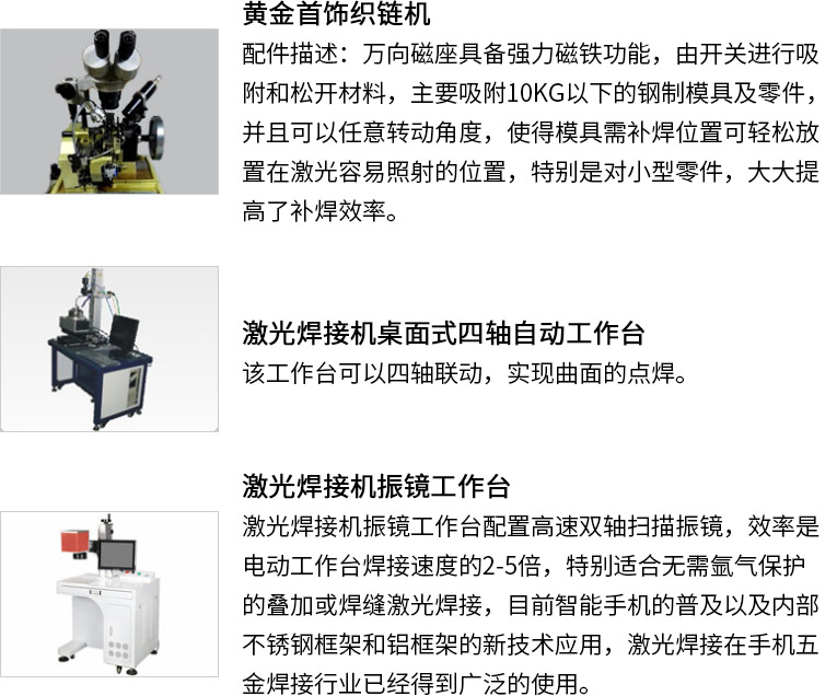 半岛(中国)激光研发针对配合黄金织链机、K金制链机、首饰织链机、项链织链机的TFL-40PF自动光纤激光焊接机,焊接机采用能量反馈技术,光点稳定,能量强劲,便与安装,实现一环一焊的功能,确保金链的耐拉强度,可以广泛应用在点焊及柔性加工需求行业等焊接。本激光焊机实现了风冷一体的小型化结构。适用于各种生产场所。