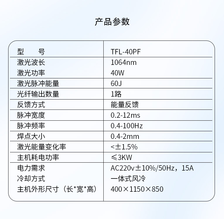 环境湿度:不高于80% 。因为焊机电源打开后,激光晶体就会持续的被冷却系统冷却,因为冷却水一般会低于室温,当环境湿度过大的时候,而激光晶体的温度又低于室温,这时激光晶体的两个端面上会凝结水雾,当激光输出的时候,这些水雾会大大降低激光输出能量,而且这些附着在激光晶体端面上的水,干了以后,会在激光晶体的膜面上留下痕迹,这将会大大加快激光晶体膜面的老化。所以,为了防止这种情况的发生,冷水机的水温设定,夏天不可以低于室温3度,冬天不可以低于5度。