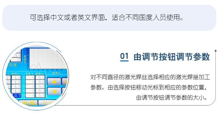 环境湿度:不高于80% 。因为焊机电源打开后,激光晶体就会持续的被冷却系统冷却,因为冷却水一般会低于室温,当环境湿度过大的时候,而激光晶体的温度又低于室温,这时激光晶体的两个端面上会凝结水雾,当激光输出的时候,这些水雾会大大降低激光输出能量,而且这些附着在激光晶体端面上的水,干了以后,会在激光晶体的膜面上留下痕迹,这将会大大加快激光晶体膜面的老化。所以,为了防止这种情况的发生,冷水机的水温设定,夏天不可以低于室温3度,冬天不可以低于5度。