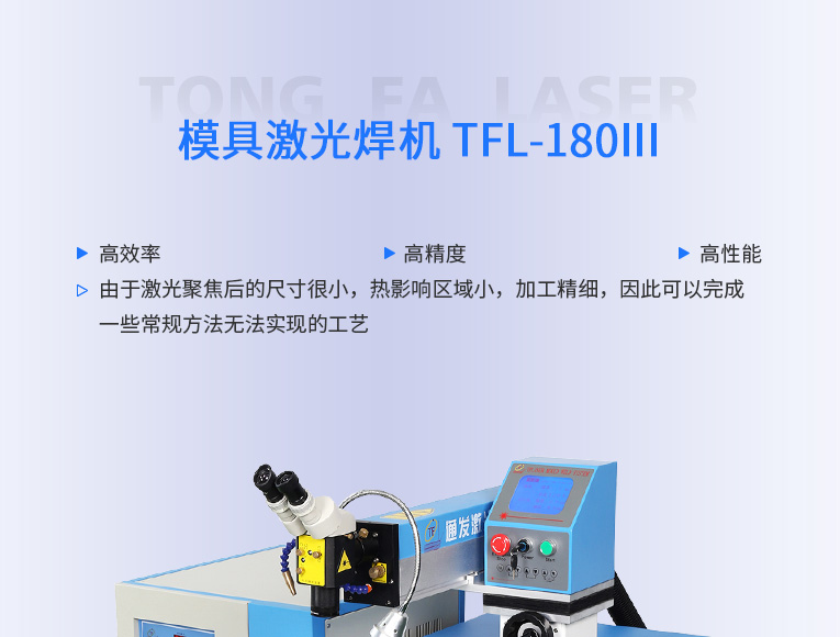普通型模具激光焊机TFL-180Ⅲ是半岛(中国)激光公司的模具激光焊机中销量较大的传统型,配置激光头手摇升降与工作台按钮电动升降实现焊接不同厚度模具的激光焊加工。本系列机型适用于各类精密注塑模具激光补焊、压铸模具激光修补焊接;同时也适合铸件沙孔激光修补、模具磨损激光修复、过切加工等的激光修补;各类金属结构件激光焊接加工、不锈钢首饰激光焊接加工。