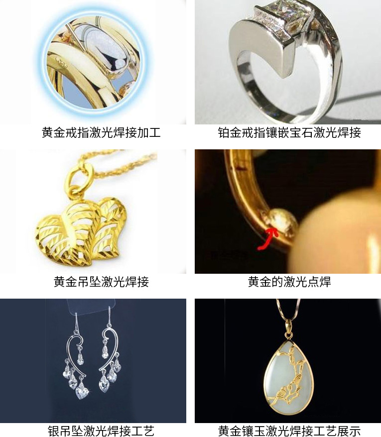 8、可激光焊接各种金属材质:金,银,铂金,铜,钛,不锈钢等各种金属材料。包括:戒指,耳环,手链,项链,领带夹,袖口等珠宝首饰,金属饰品的激光焊接。