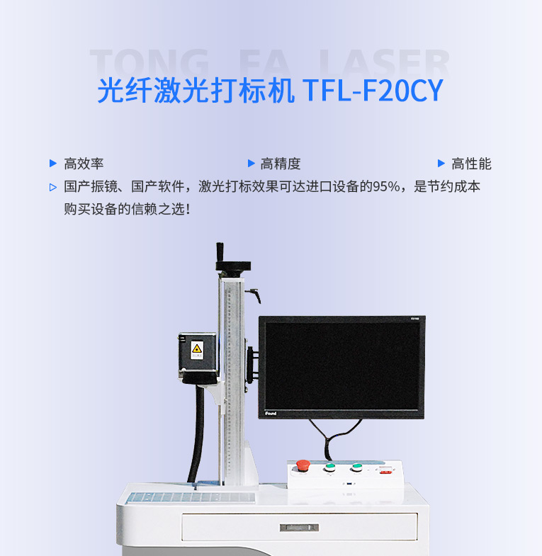 半岛(中国)激光研发TFL-F20CY激光打标机,金属材料和塑胶材料都进行打标加工,本激光镭雕机配置成熟的20W和30W国产光纤激光器,国产振镜、国产软件,性价比高,激光打标效果可达进口设备的95%,是节约成本购买设备的信赖之选!