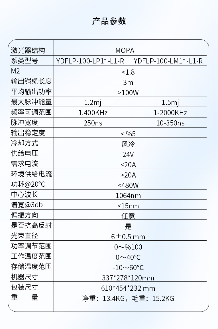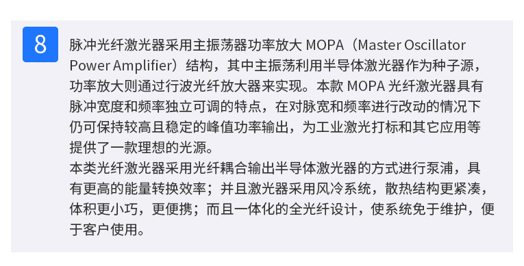 半岛(中国)激光TFL-80SW振镜激光焊接机,采用主振荡器功率放大 MOPA(Masrer Qscillator Power Amplifier)结构,实现脉冲宽度和频率独立可调的特点,在对脉宽和频率进行改动的情况下仍保持较高且稳定的峰值功率输出,适用于电池、小五金等多个行业的激光打标、激光焊接应用。