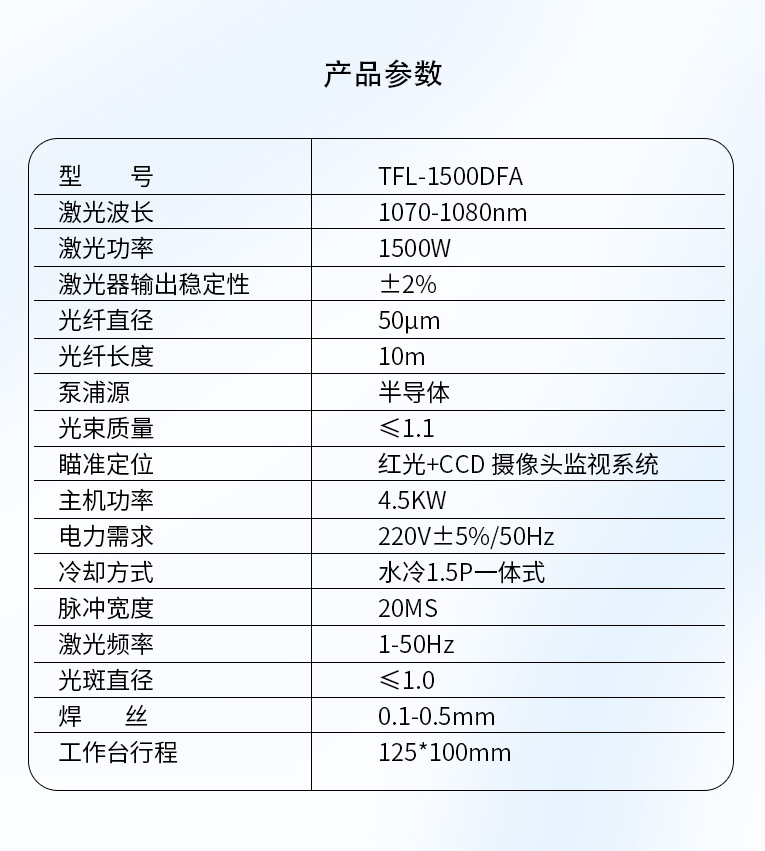 采用光纤激光器,反射率高,能量强,免维护,免调光,功耗少,相比传统 模具焊来说,安全,稳定性好超长使用寿命。 1500W光纤激光器,满足铜、铝焊接量大的模具及半岛官网登陆入口焊接加工需要。 高承重底座及工作台,保持轻便灵活的优点,同时提供更高承载能力。 配备.1.5P大功率一体式水冷水机,保证了大功率焊接的稳定性。